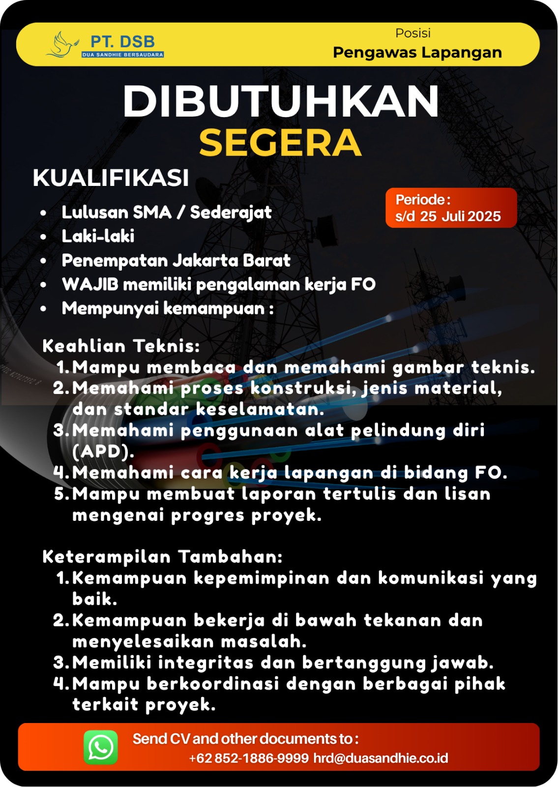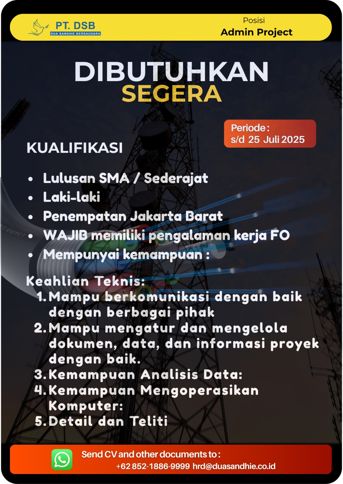 At PT Dua Shandie Bersaudara, our vision is to provide the best customer service by empowering individuals and businesses to confidently navigate the world of telecommunications and Information and Communication Technology (ICT). We strive to be a trusted partner, offering innovative management services that help our clients achieve their goals and secure a prosperous future.